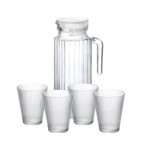 Jogo de jarra de vidro 1 litro com 4 copos de 240 ml Esme, design clássico, vidro cristalino de alta qualidade, ideal para água, sucos e drinks. Produto com caixa resistente, perfeito para presente. Fácil limpeza e durabilidade garantida.